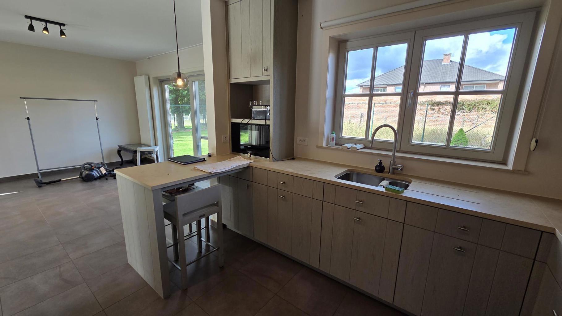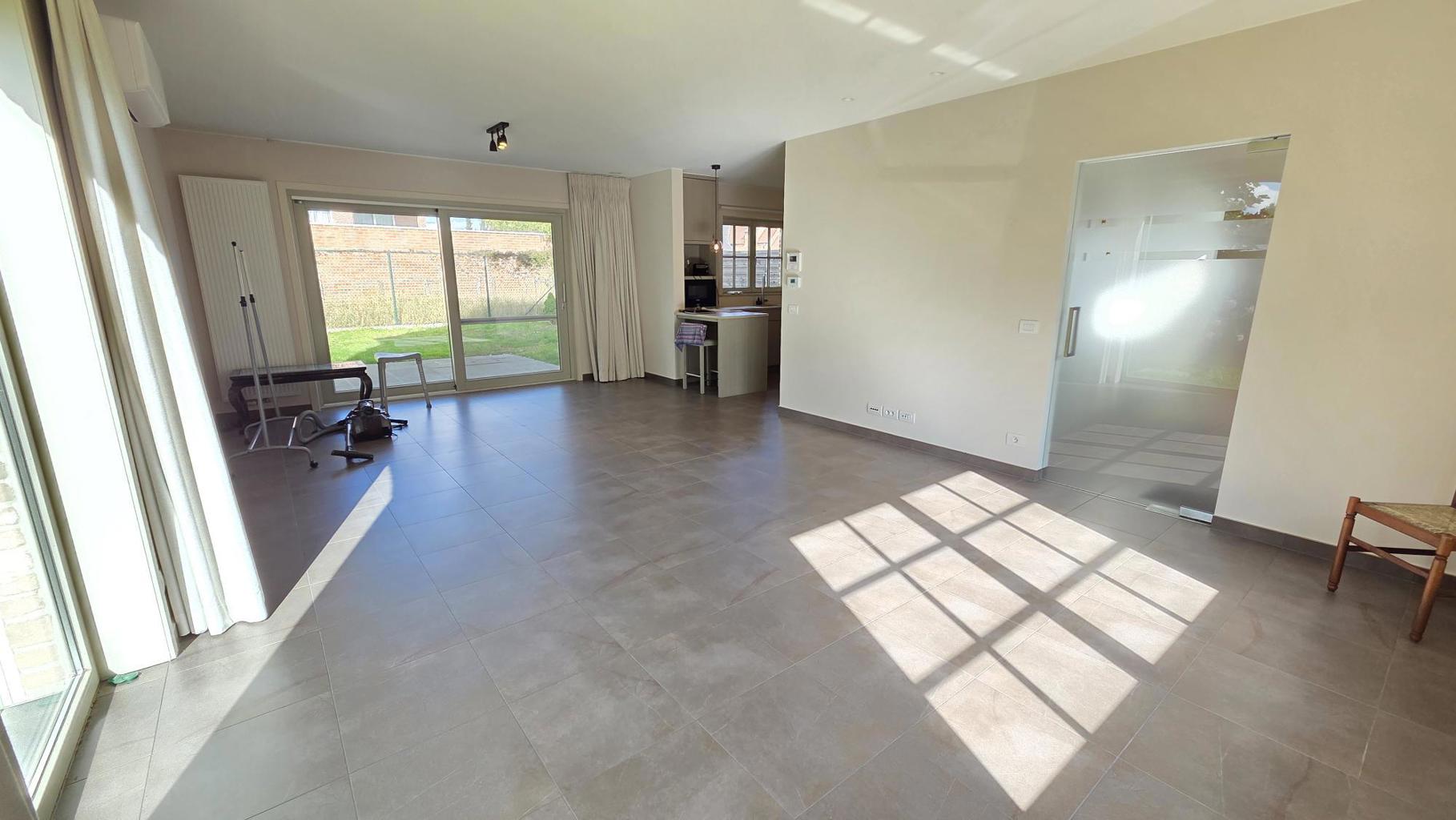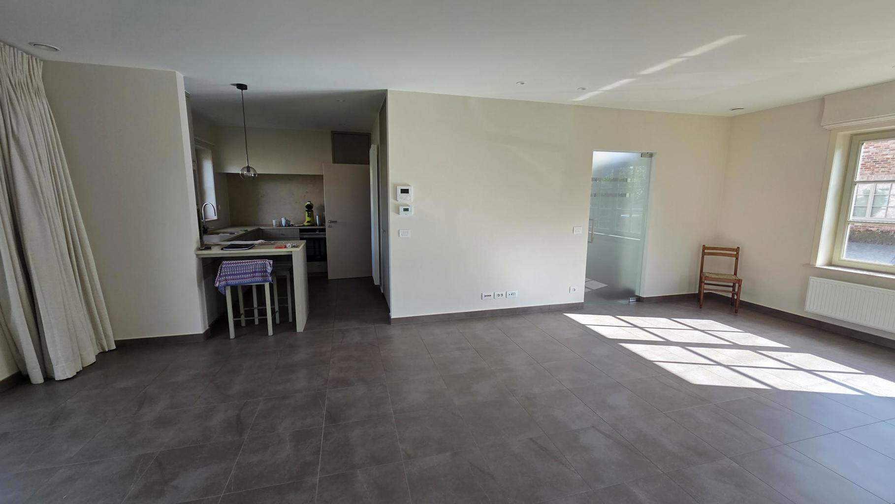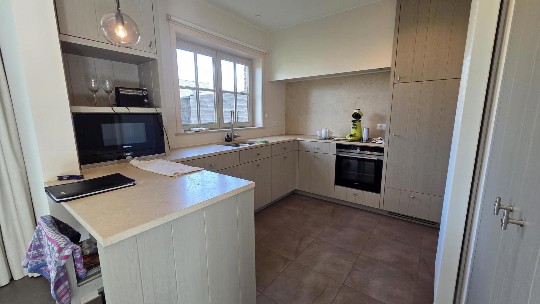 De indeling is als volgt: bij binnenkomst een inkomhal met apart gastentoilet en een glazen deur die ons toegang geeft tot de woonkamer met open keuken (volledig geïnstalleerd). Aansluitend aan de keuken een handige berging.