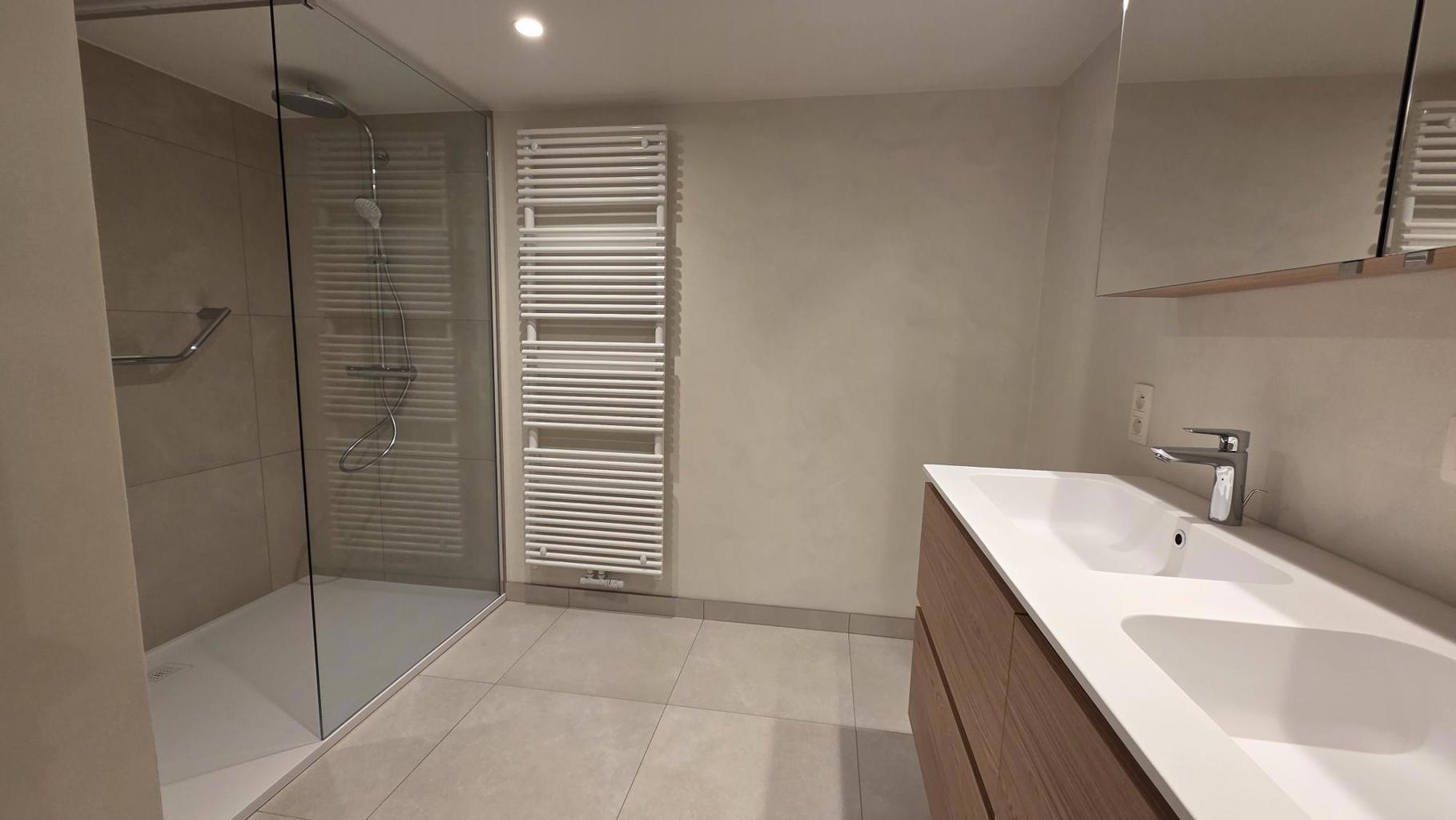 Het appartement omvat een inkomhal met gastentoilet, een gezellige woonkamer met open keuken en aangename eethoek, twee volwaardige slaapkamers en een badkamer met dubbele wastafel en ruime inloopdouche.
