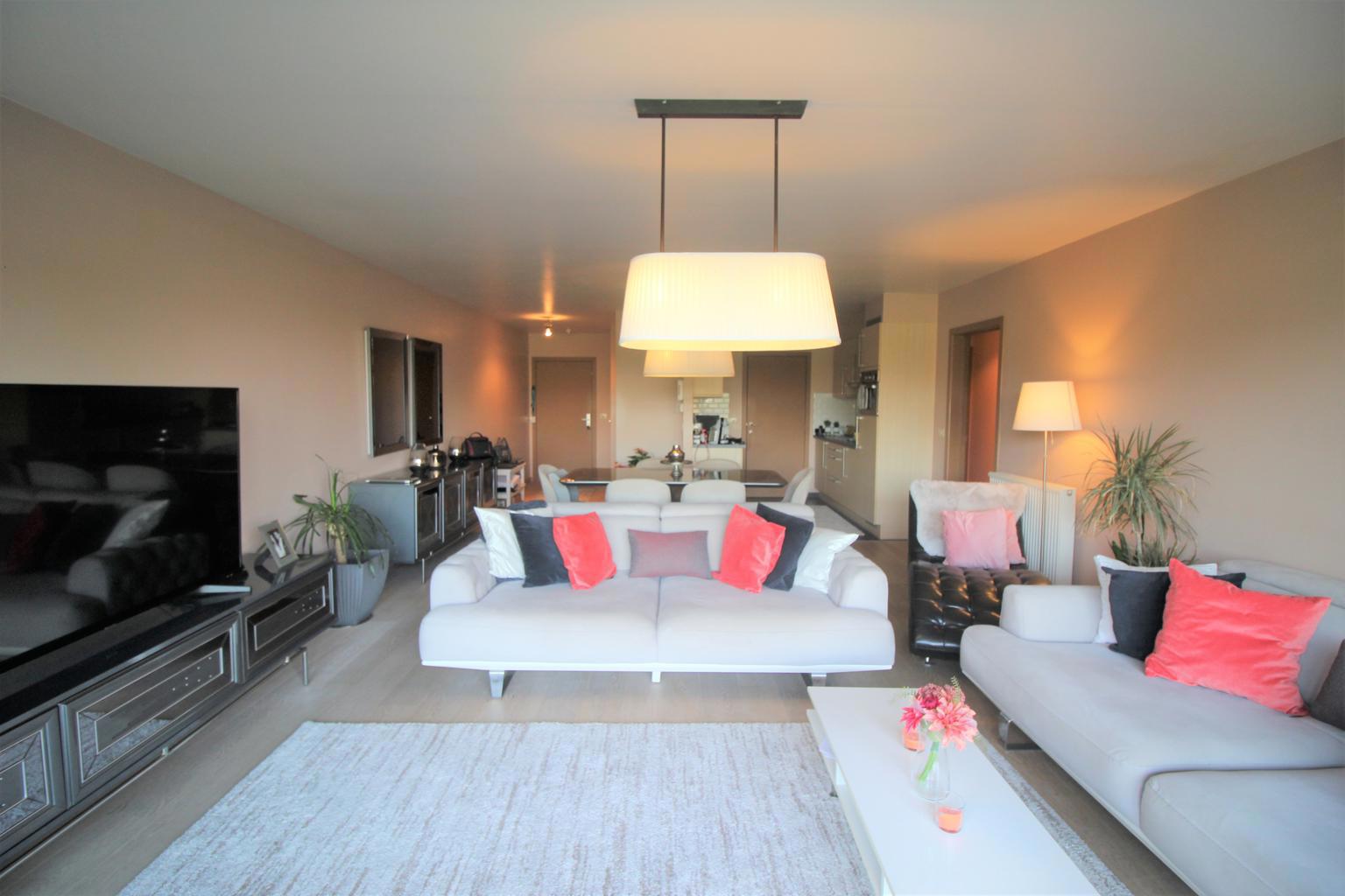 Het appartement bevindt zich op het eerste verdiep (lift aanwezig in het gebouw). De indeling is als volgt: bij binnenkomst hebben we een inkomhal met apart gastentoilet. Via de inkomhal komen we terecht in de ruime woonkamer met een leuk, ruim terras en een prachtig zicht! Er is een open keuken voorzien van alle toestellen (combi microgolf/oven, vaatwasser, frigo, kookplaat en dampkap), aansluitend is een praktische berging aanwezig (aansluiting wasmachine en droogkast). Via de nachthal hebben we toegang tot de twee ruime slaapkamers en de badkamer. Aan slaapkamer 2 is een tweede terras voorzien. In de grote badkamer vinden we een dubbel lavabomeubel, een ligbad, een douche en een toilet. In de ondergrondse garage is een privatieve staanplaats en een extra berging aanwezig.