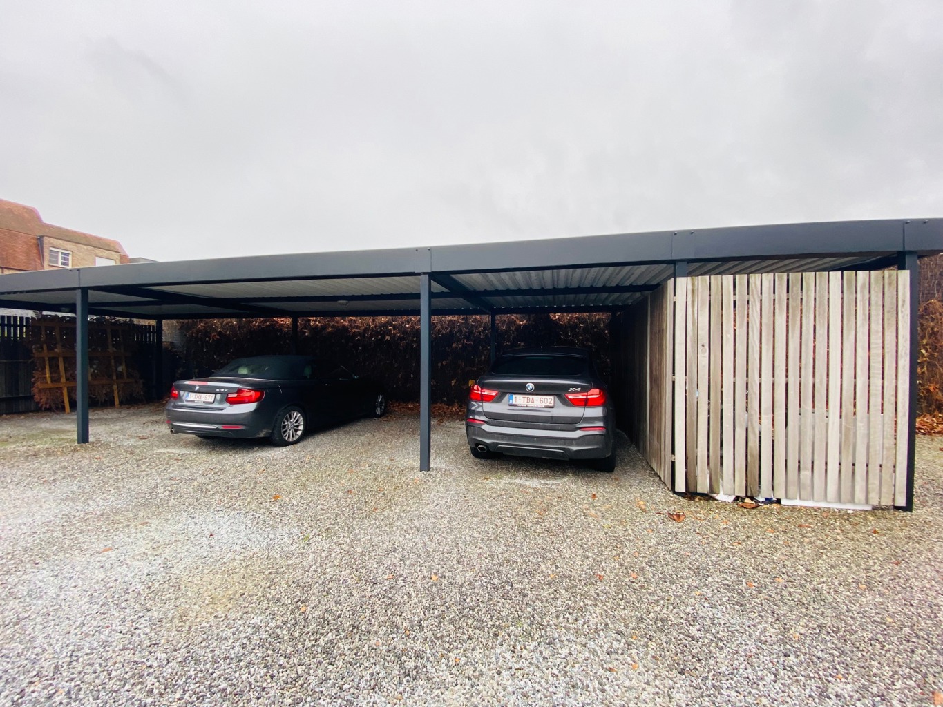Er is een fietsenstalling en private carport voorzien in de prijs.