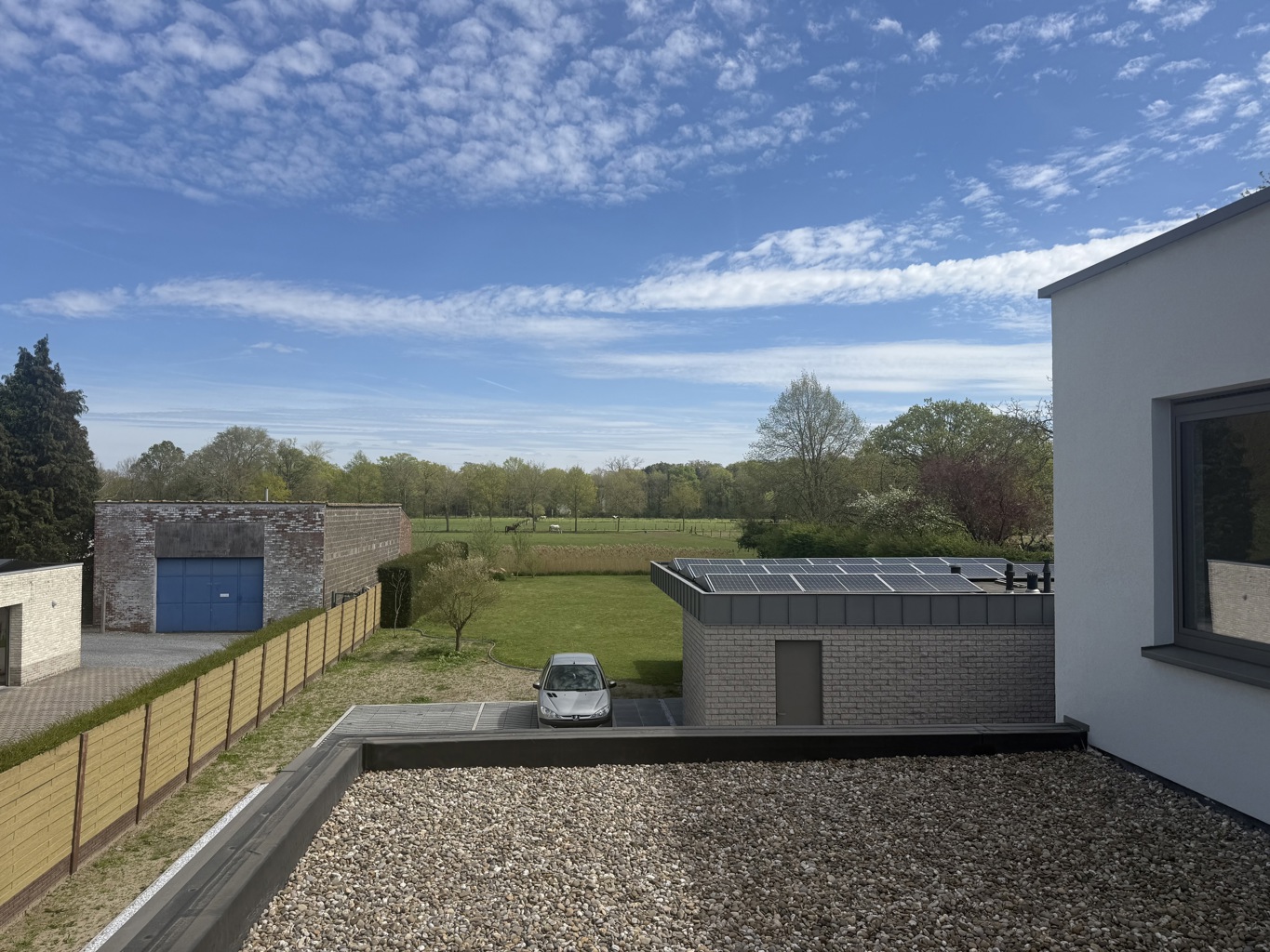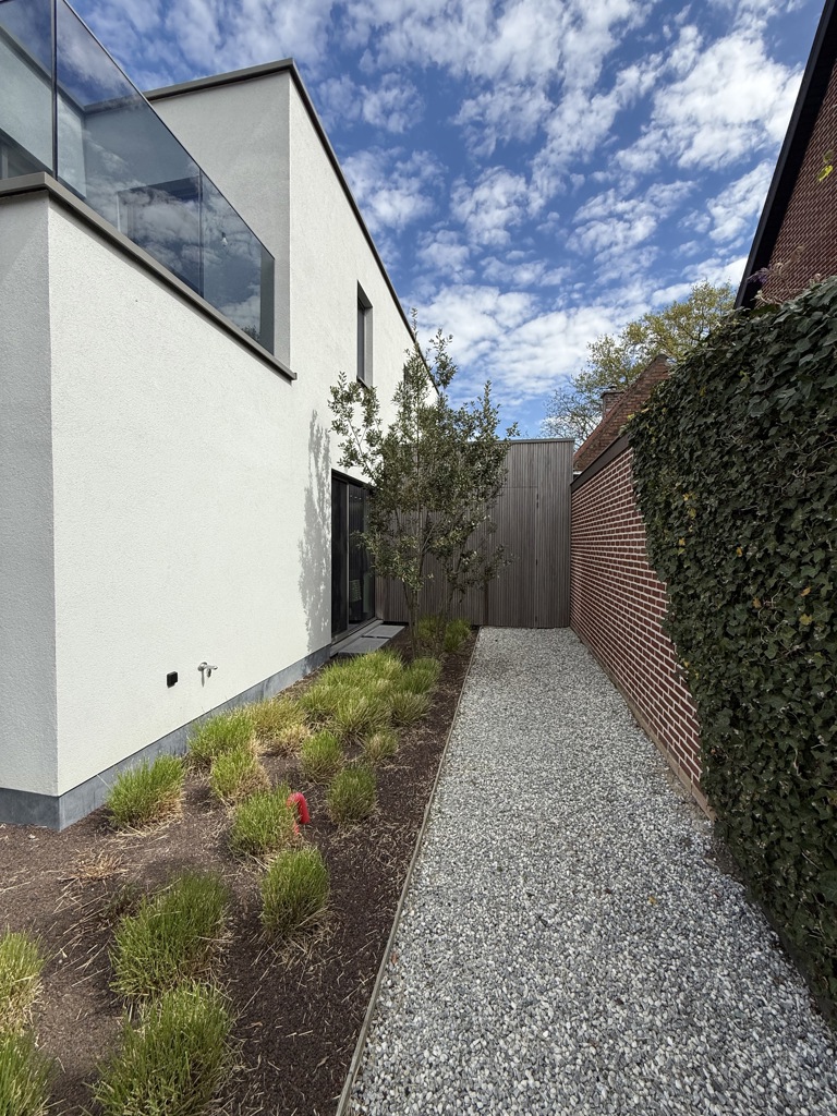 Buiten geniet u van twee privatieve staanplaatsen en een afgesloten buitenberging, perfect voor fietsen of extra opslag.