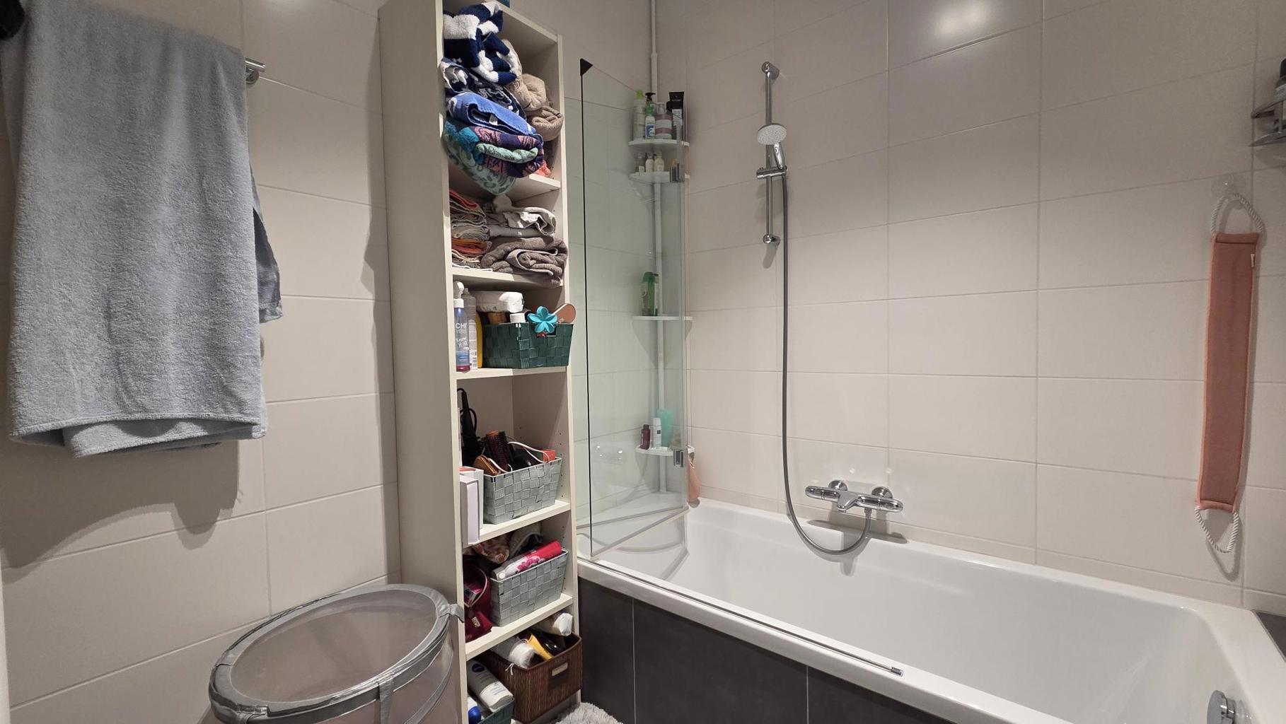 Bij binnenkomst word je verwelkomd in de inkomhal met een apart gastentoilet. De lichtrijke woonkamer vormt het hart van de woning: dankzij de grote ramen en de open, volledig geïnstalleerde keuken geniet je hier van een heerlijk ruimtelijk gevoel. Praktisch is de berging direct naast de keuken, met alle aansluitingen voor je wasmachine en droogkast.