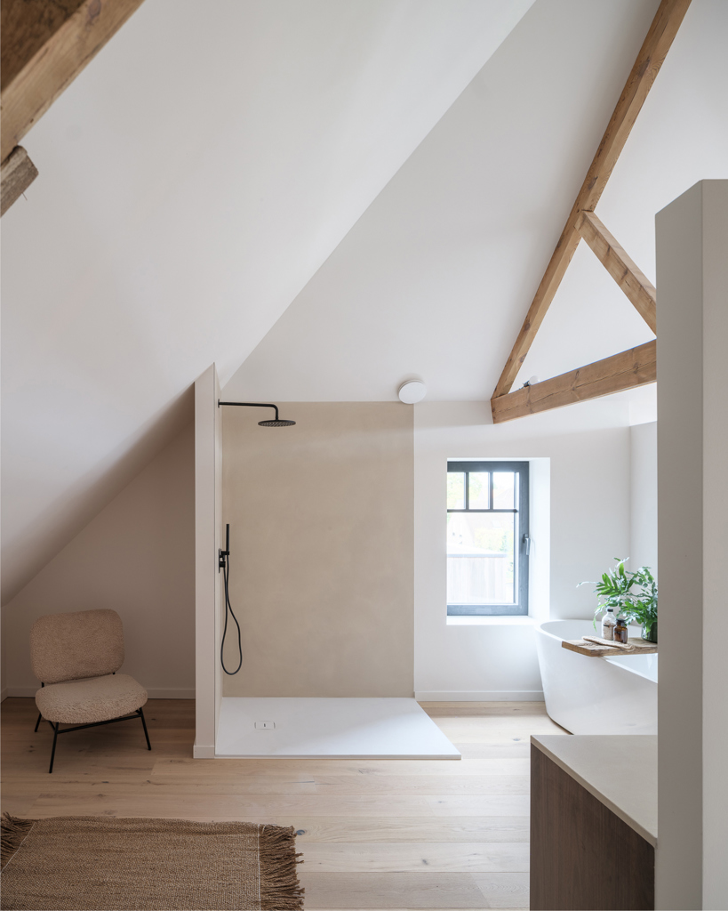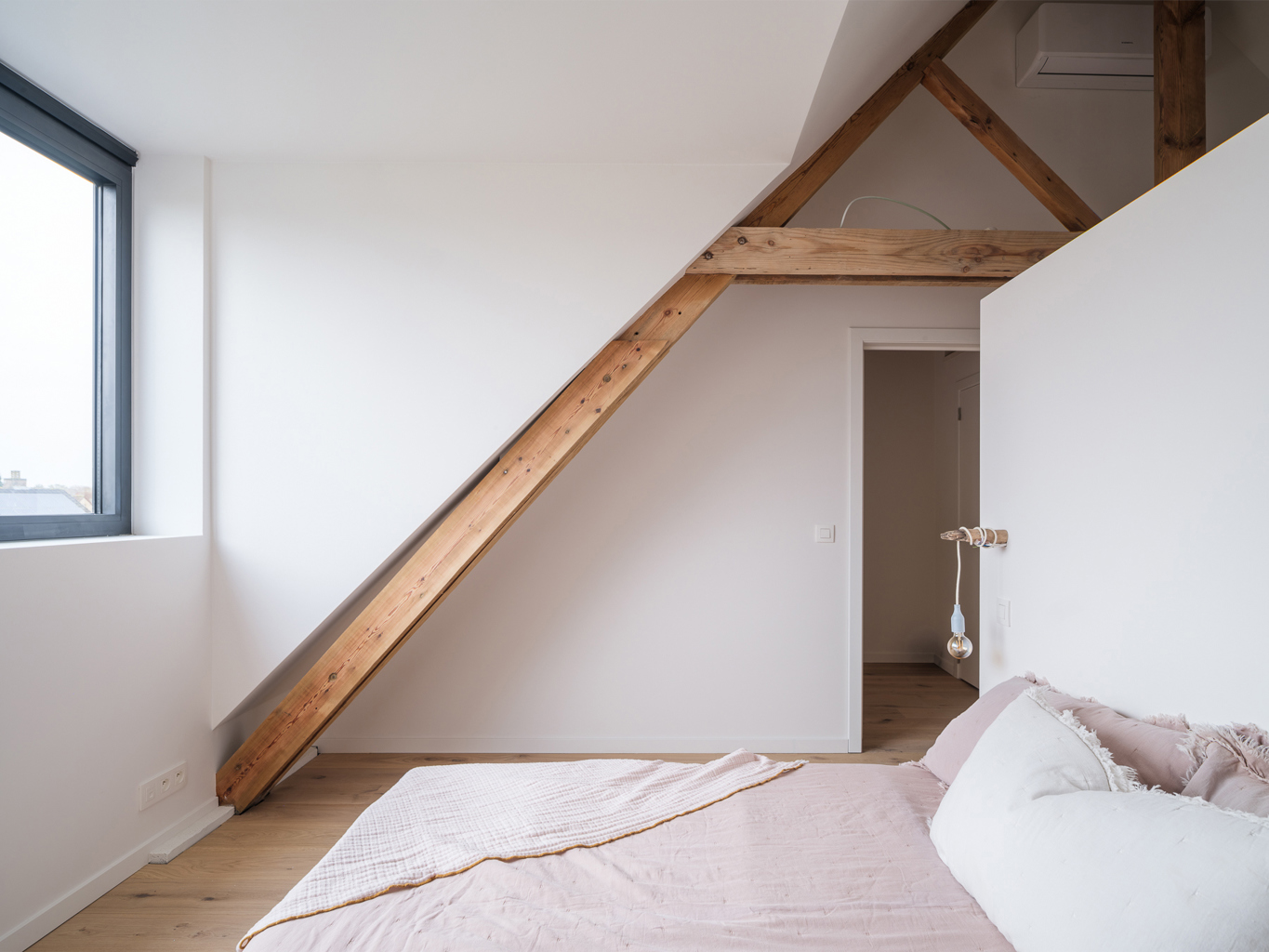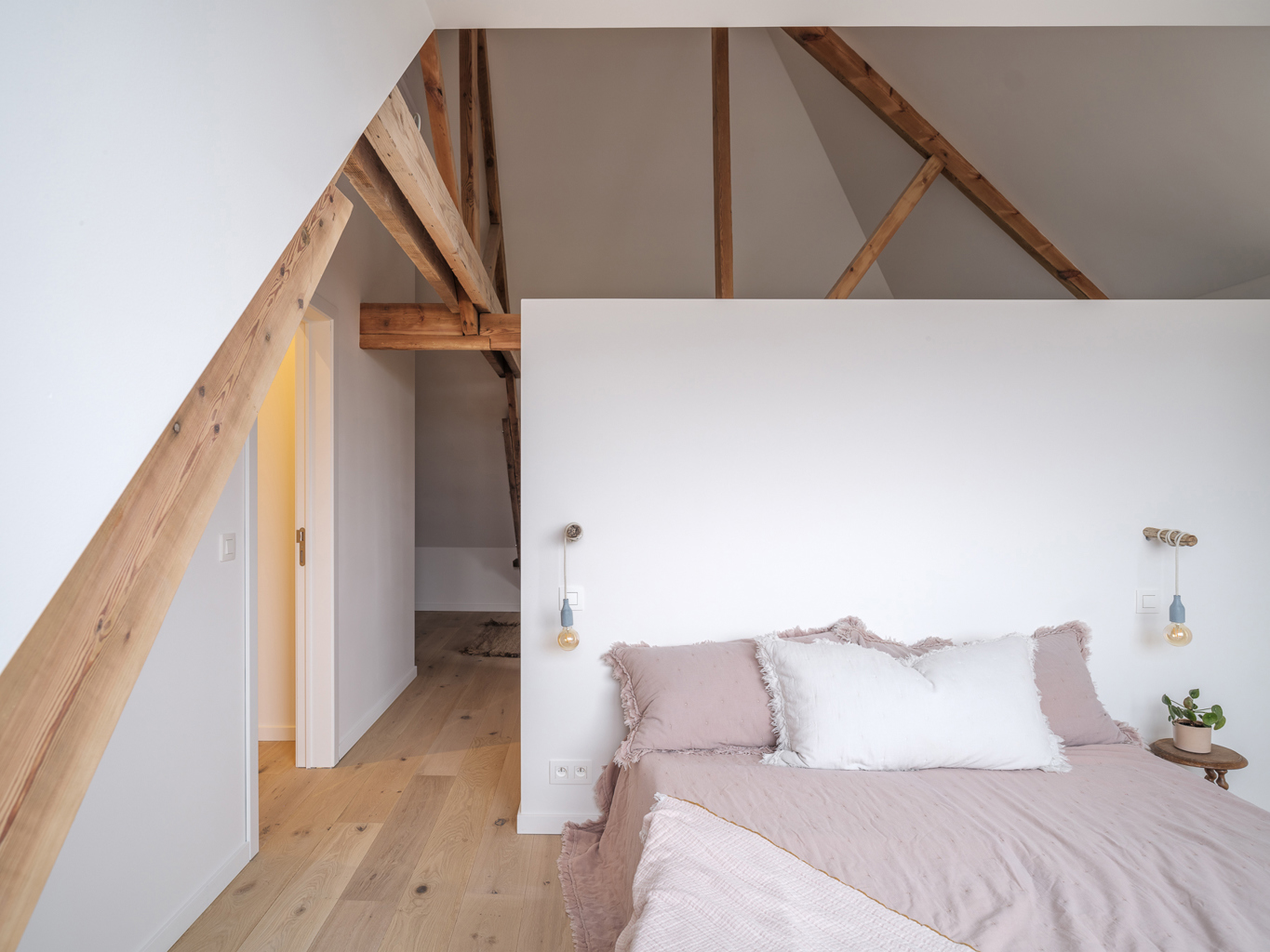 De zolderverdieping werd omgetoverd tot een prachtige masterbedroom met eigen badkamer, een ware oase van rust.