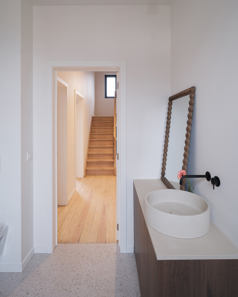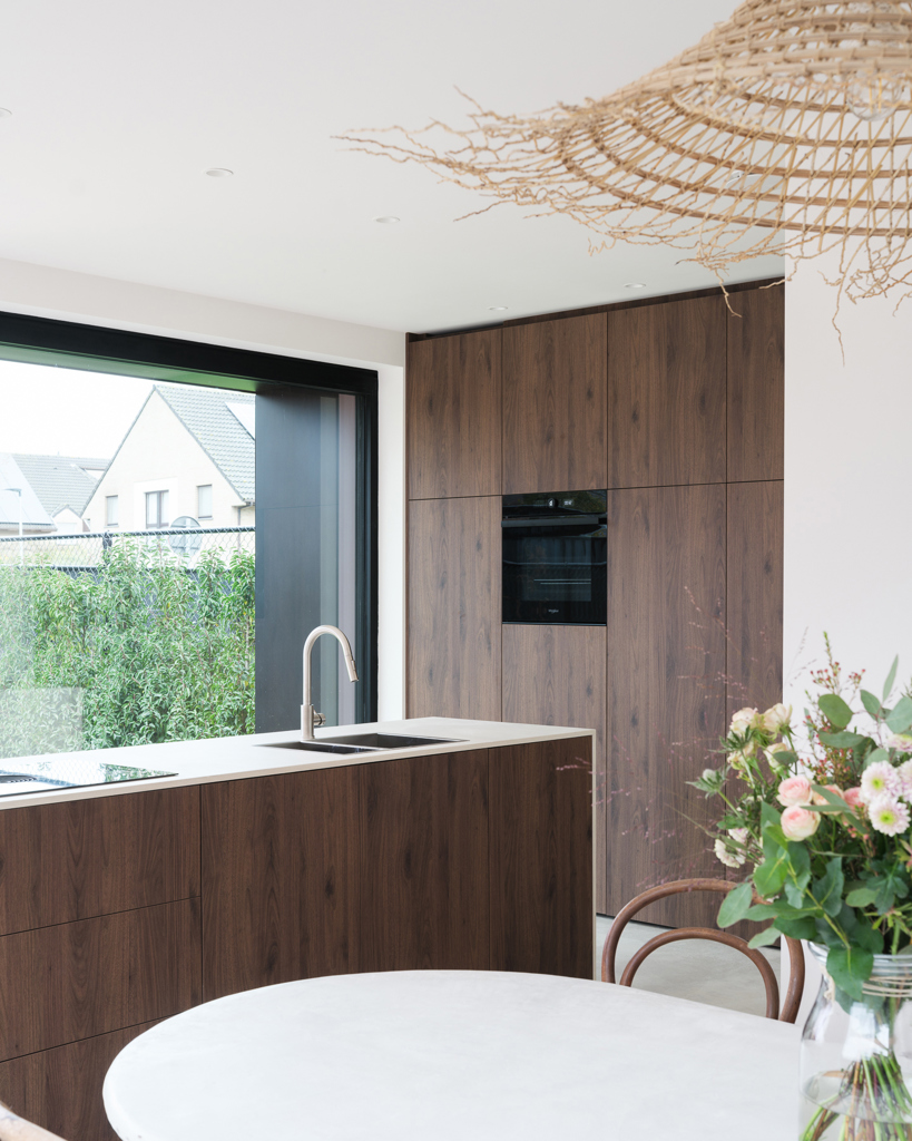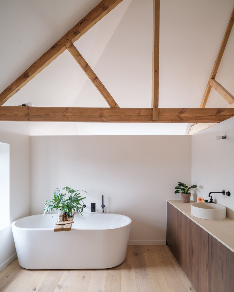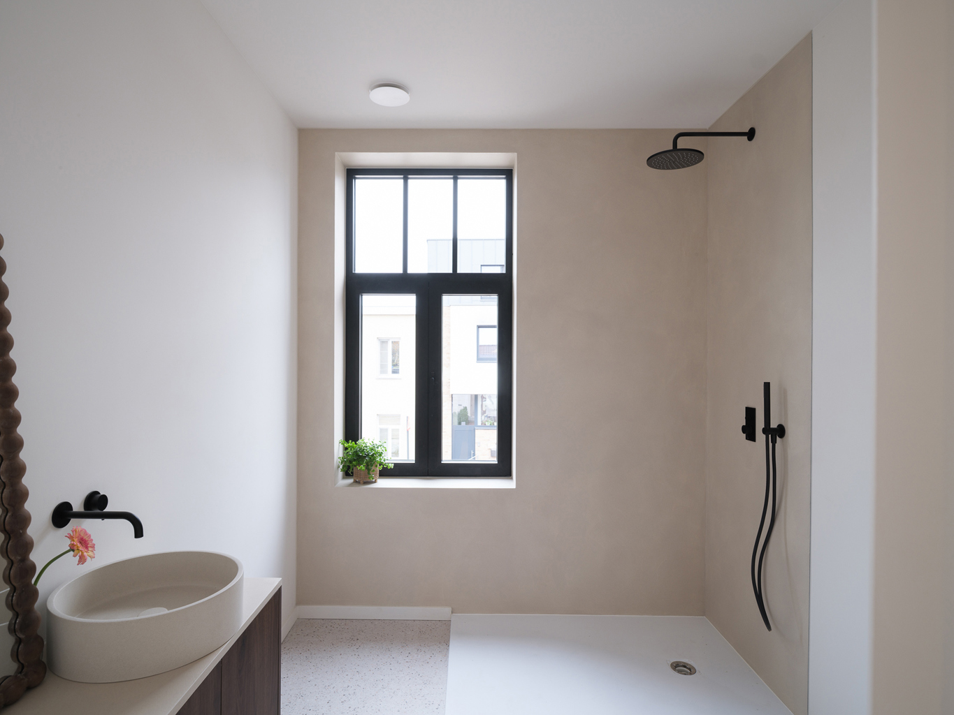 De zolderverdieping werd omgetoverd tot een prachtige masterbedroom met eigen badkamer, een ware oase van rust.