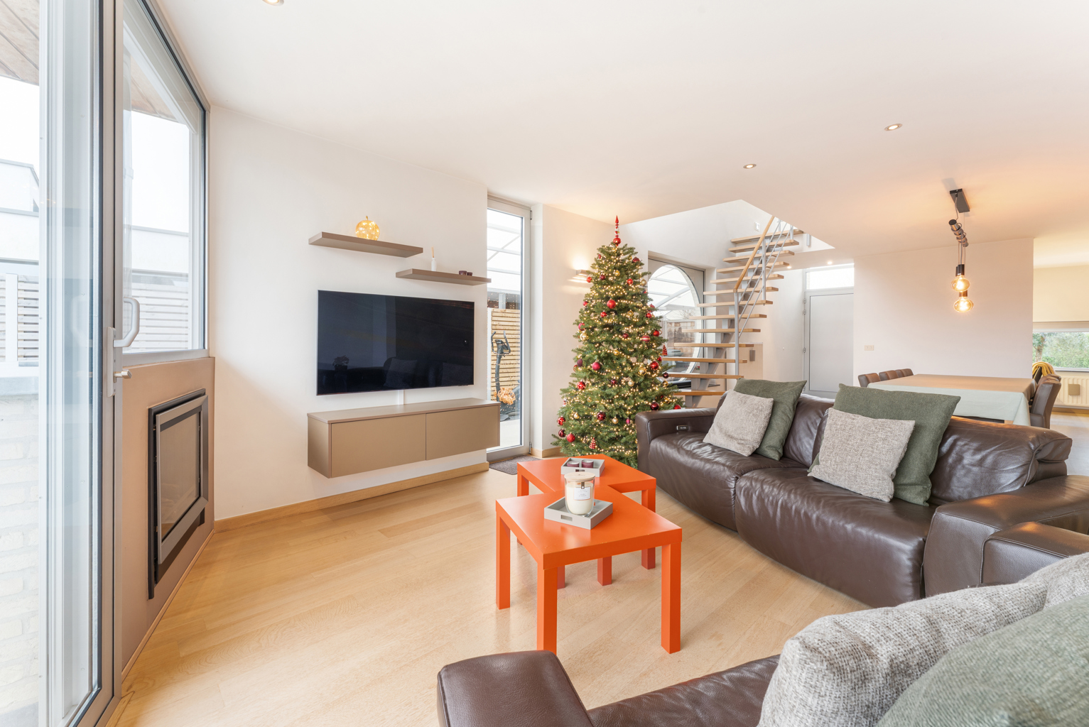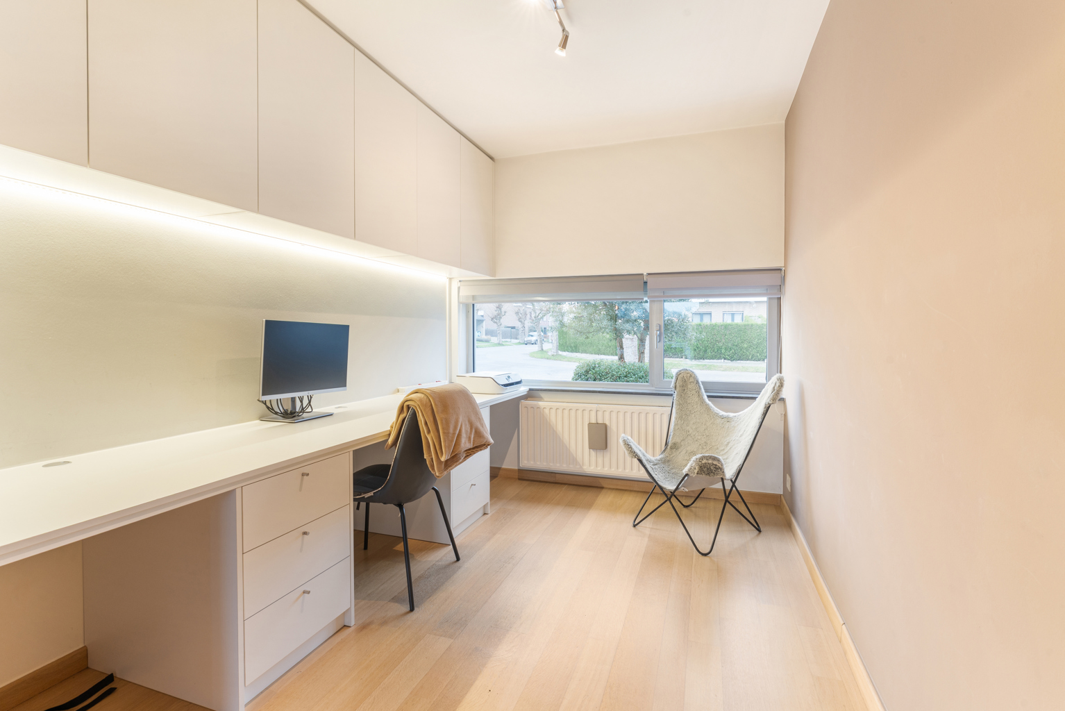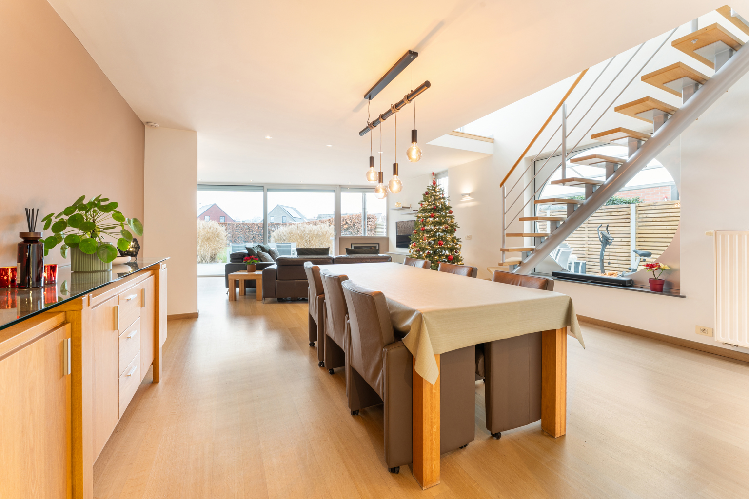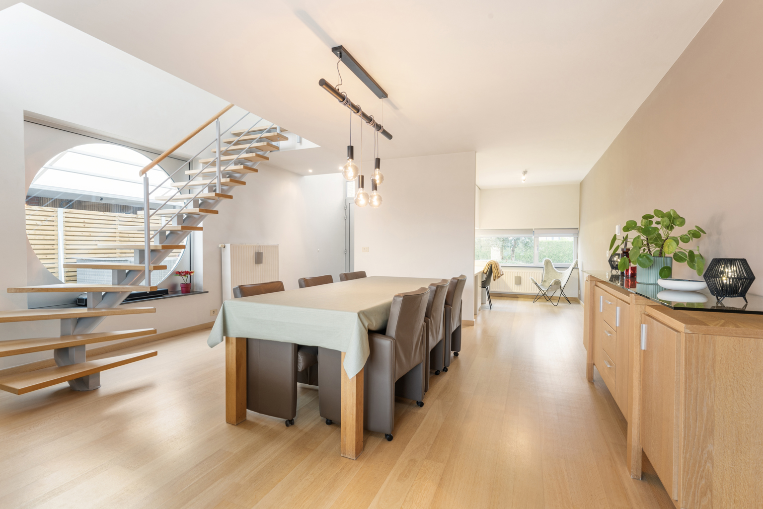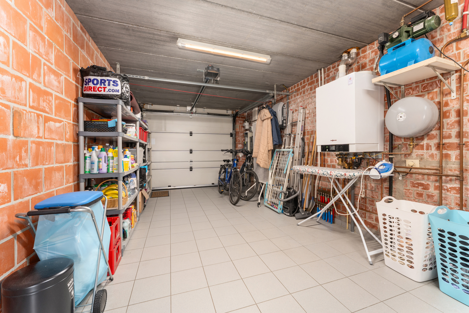 Bij het betreden van de woning kom je in een verzorgde inkomhal met apart gastentoilet. De lichtrijke leefruimte straalt gezelligheid uit en sluit naadloos aan op een afzonderlijke maar open bureauruimte, ideaal voor thuiswerk of studeerhoek. De open keuken is praktisch ingericht en vormt een mooi geheel met de leefruimte. Op het gelijkvloers bevinden zich verder een douchekamer en een inpandige garage, wat zorgt voor extra comfort en bergruimte.