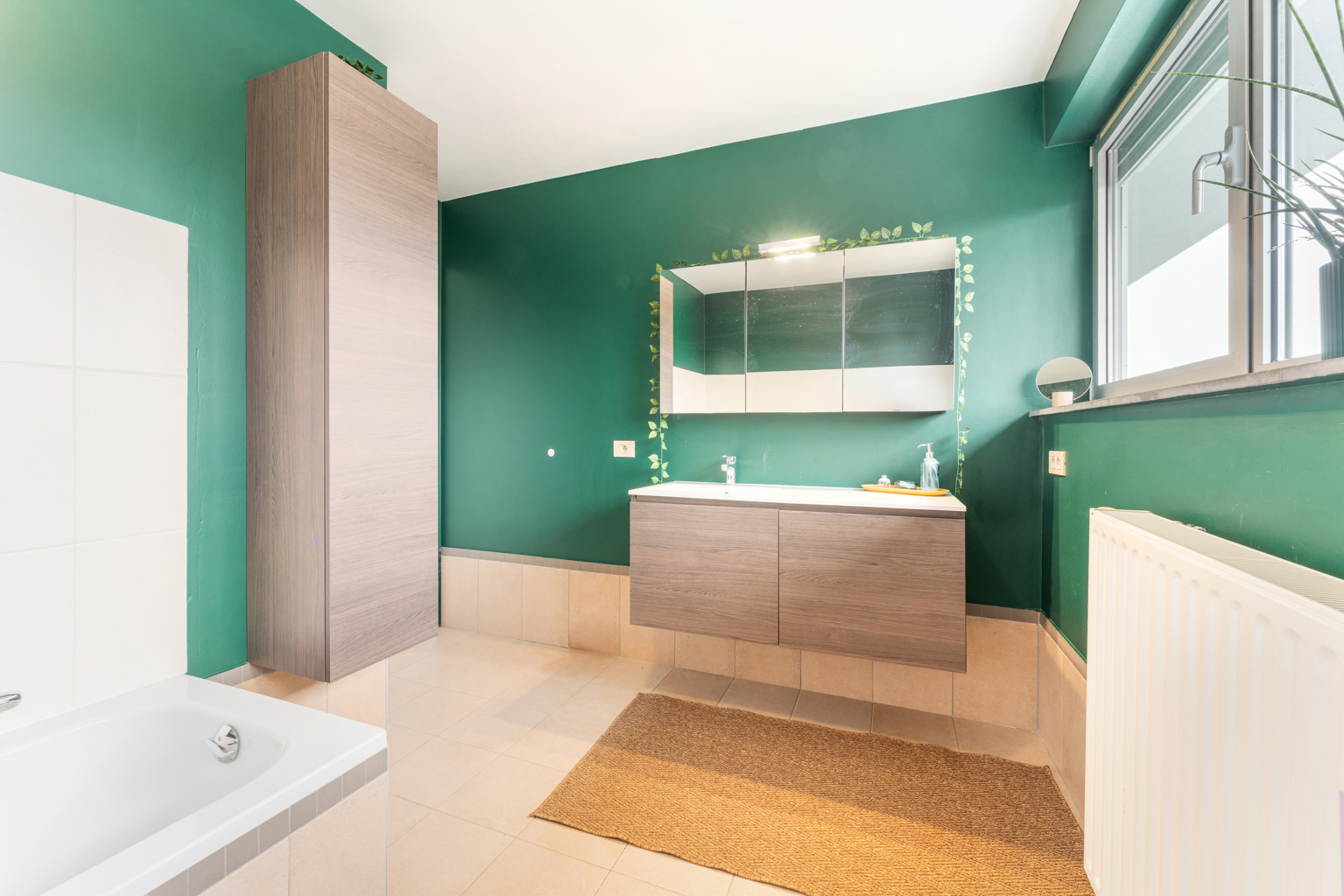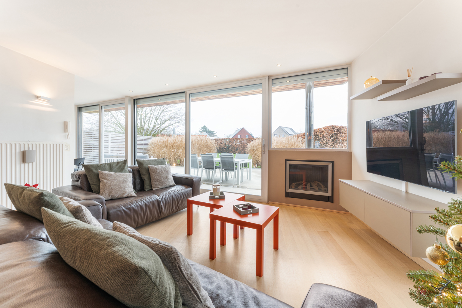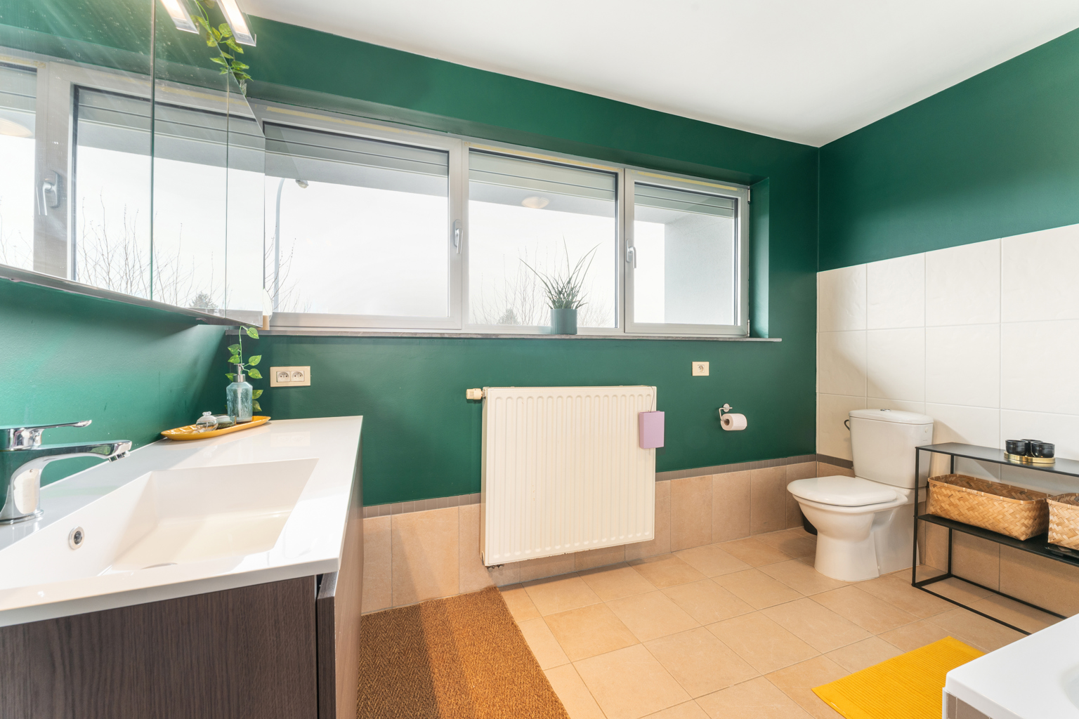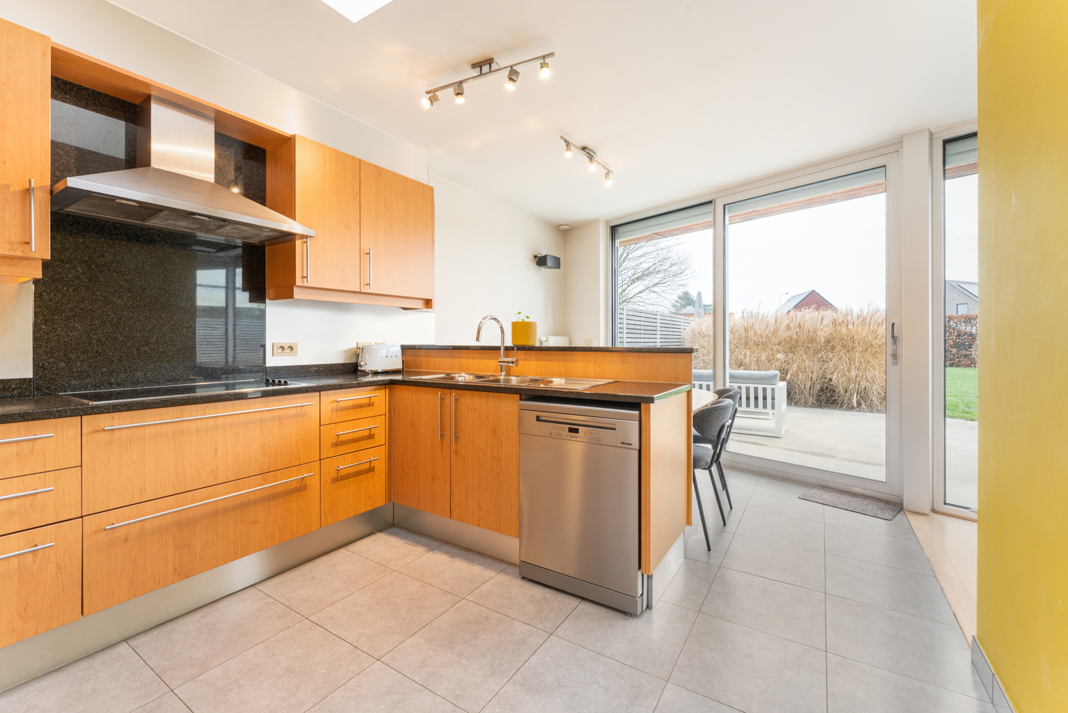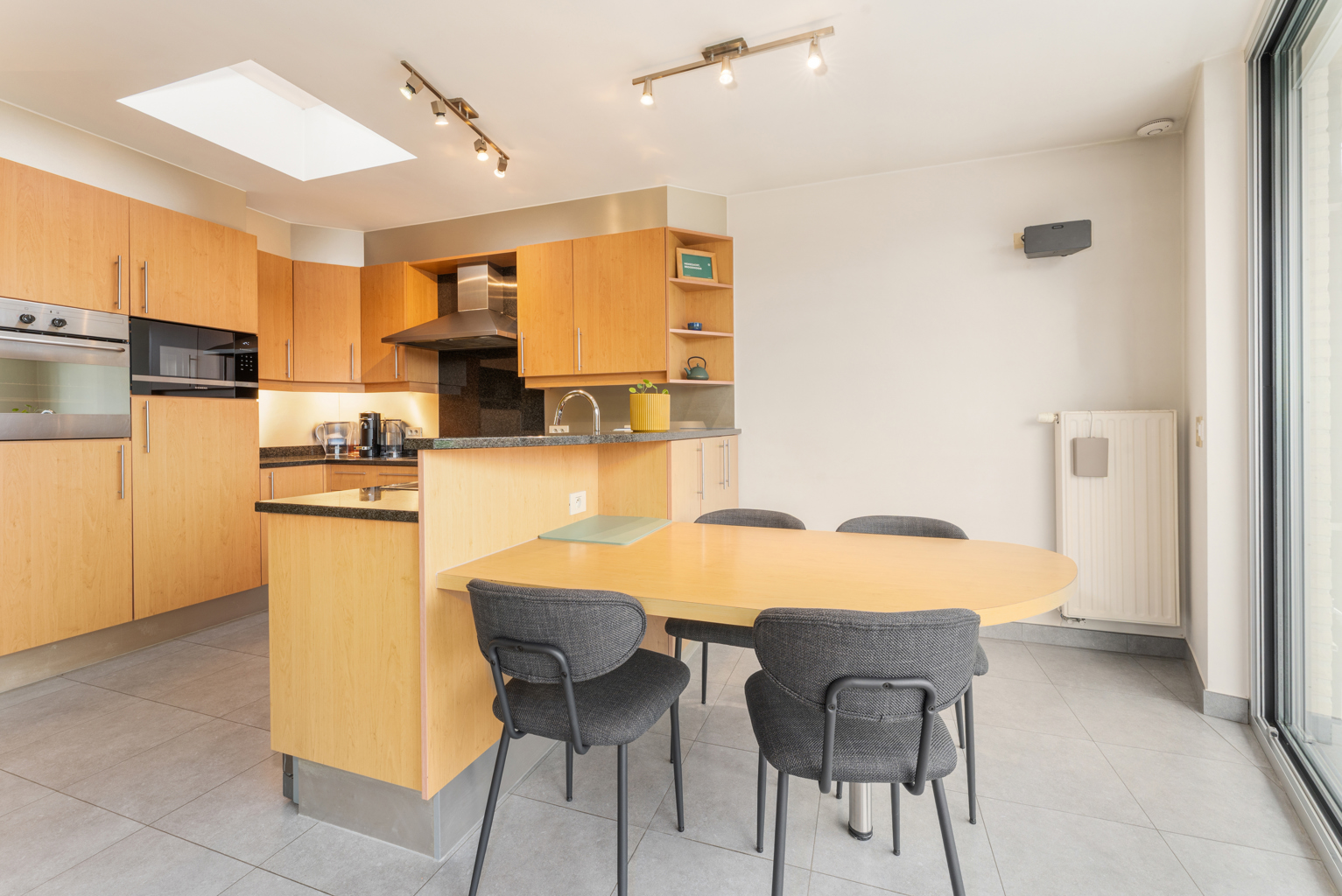 Bij het betreden van de woning kom je in een verzorgde inkomhal met apart gastentoilet. De lichtrijke leefruimte straalt gezelligheid uit en sluit naadloos aan op een afzonderlijke maar open bureauruimte, ideaal voor thuiswerk of studeerhoek. De open keuken is praktisch ingericht en vormt een mooi geheel met de leefruimte. Op het gelijkvloers bevinden zich verder een douchekamer en een inpandige garage, wat zorgt voor extra comfort en bergruimte.
